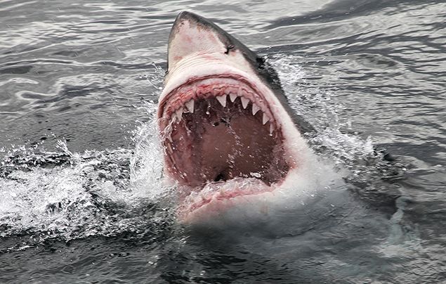 Image ⓒ Picture of great white shark near surface: Photograph by Natursports, Dreamstime. Picture of great white shark underwater: Photograph by Willtu, Dreamstime. Picture of great whie shark with mouth open: Photograph by Peternile, Dreamstime.