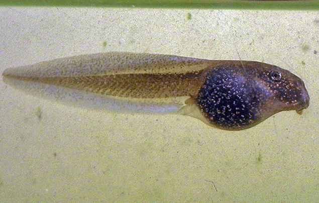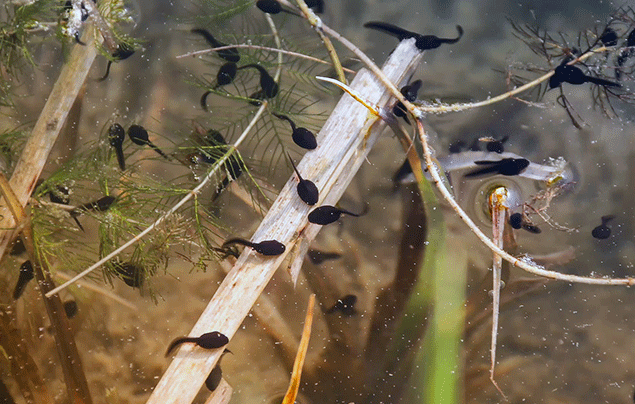 Unlike adult frogs, tadpoles can’t go on land – so they feed on plant material filtered from the water, and tear off tiny chunks of nearby vegetation.